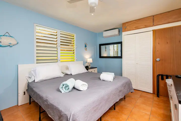 All of our bedrooms have air conditioning, guaranteeing a perfect night's sleep. There is one bedroom with a King bed and another bedroom with two Full beds. There are ceiling fans as wellas floor fans.